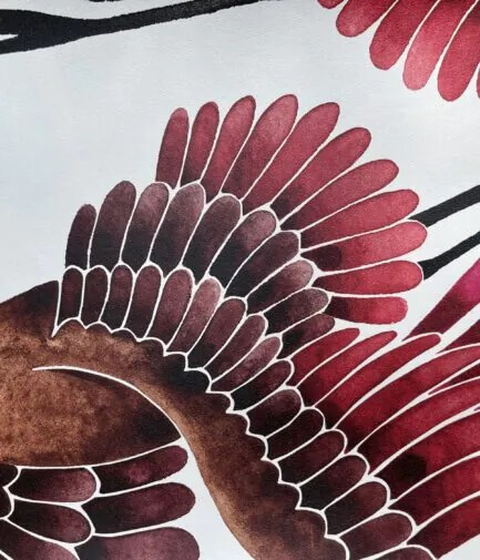 Créé par Emilie Bouguereau le modèle « Les Grues » nous entraine vers les souvenirs de voyages de l’artiste à travers le regard candide et idéaliste de l’enfance. Chargées des nuances intenses de l’aquarelle, les couleurs, flamboyantes, éblouissent à dessein.