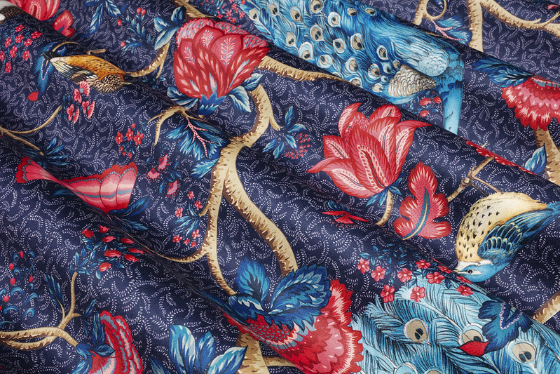 Dans un jardin onirique, un paon majestueux, perché loin du sol, laisse retomber une longue traîne chatoyante dont chaque plume satinée luit, à la fois opulente et légère, groupée avec ses semblables en un plumeau froufroutant et luxueux. Autour de lui, des fleurs généreuses en taille et en rondeur, à la gourmande teinte framboise, s’accrochent à des branches sinueuses, offrant un festin visuel de volupté et de délicatesse. De petits passereaux, posés çà et là, observent tranquillement et contribuent au spectacle d’un paradis florissant et coloré, véritable ode à la nature et à ses attraits décoratifs. Le modèle Alexandra est imprimé sur velours pour un caractère encore plus séduisant.