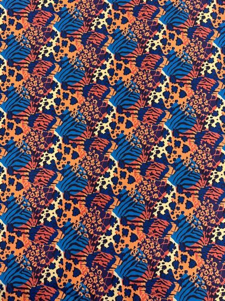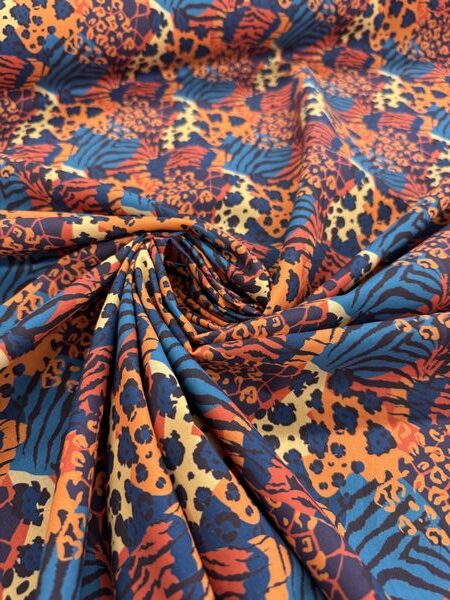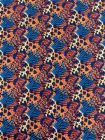 Tissu coton imprimé animalier – Un mélange audacieux de couleurs vives avec de l’orange flamboyant, du bleu profond et des touches de rouge et beige. Léger et respirant, ce coton est idéal pour vos créations mode ou déco pleines de style et d’originalité.