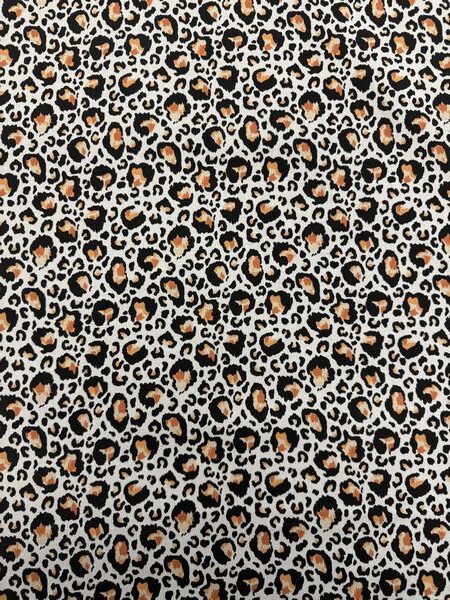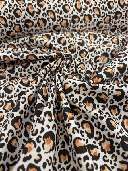 Tissu coton imprimé léopard – Indémodable et élégant, ce tissu en coton arbore un motif léopard noir et orangé sur fond clair. Léger, souple et respirant, il est idéal pour vos créations couture : robes, chemises, jupes, accessoires ou décoration. Un tissu intemporel qui apporte une touche sauvage et tendance à tous vos projets.