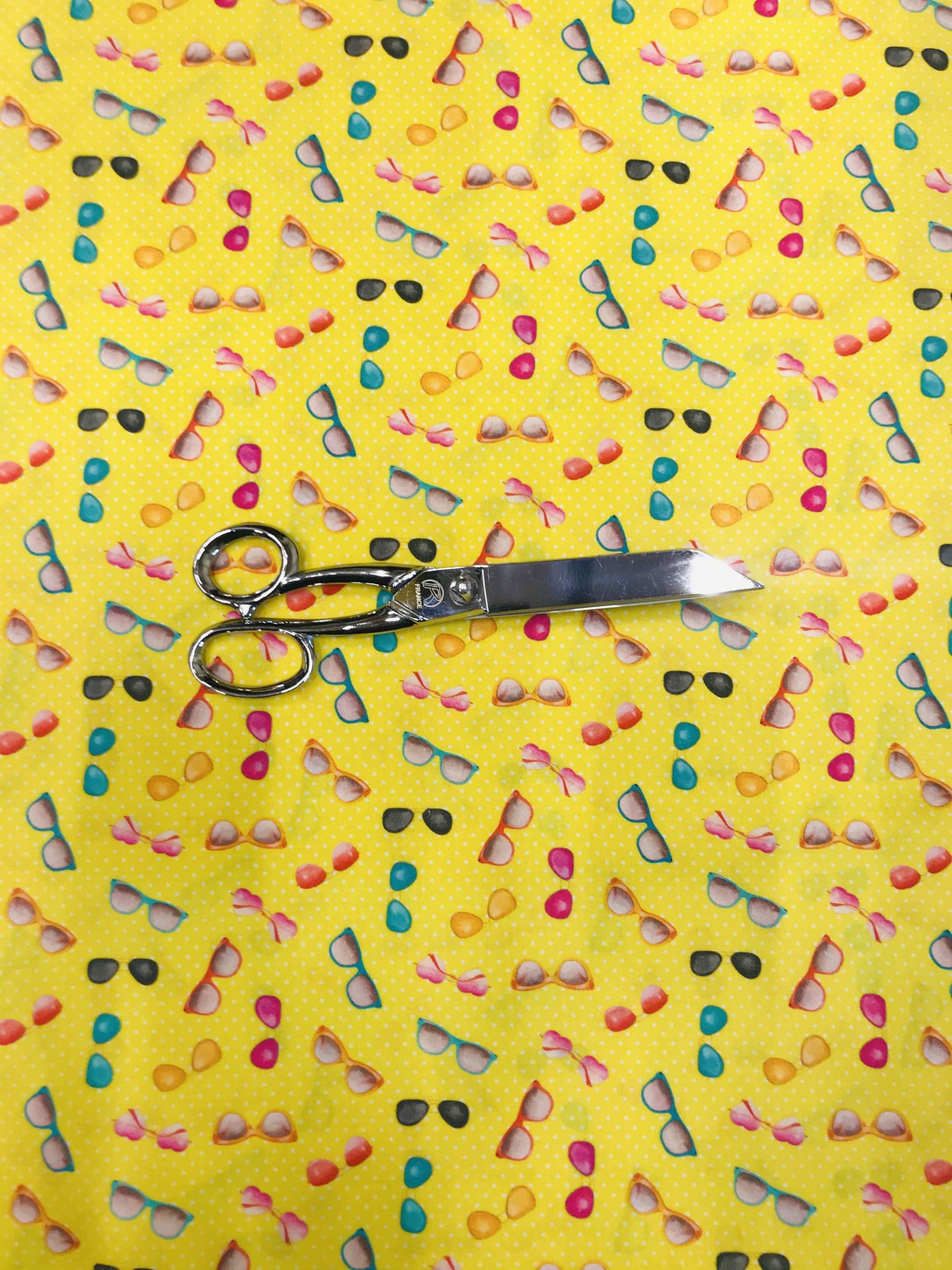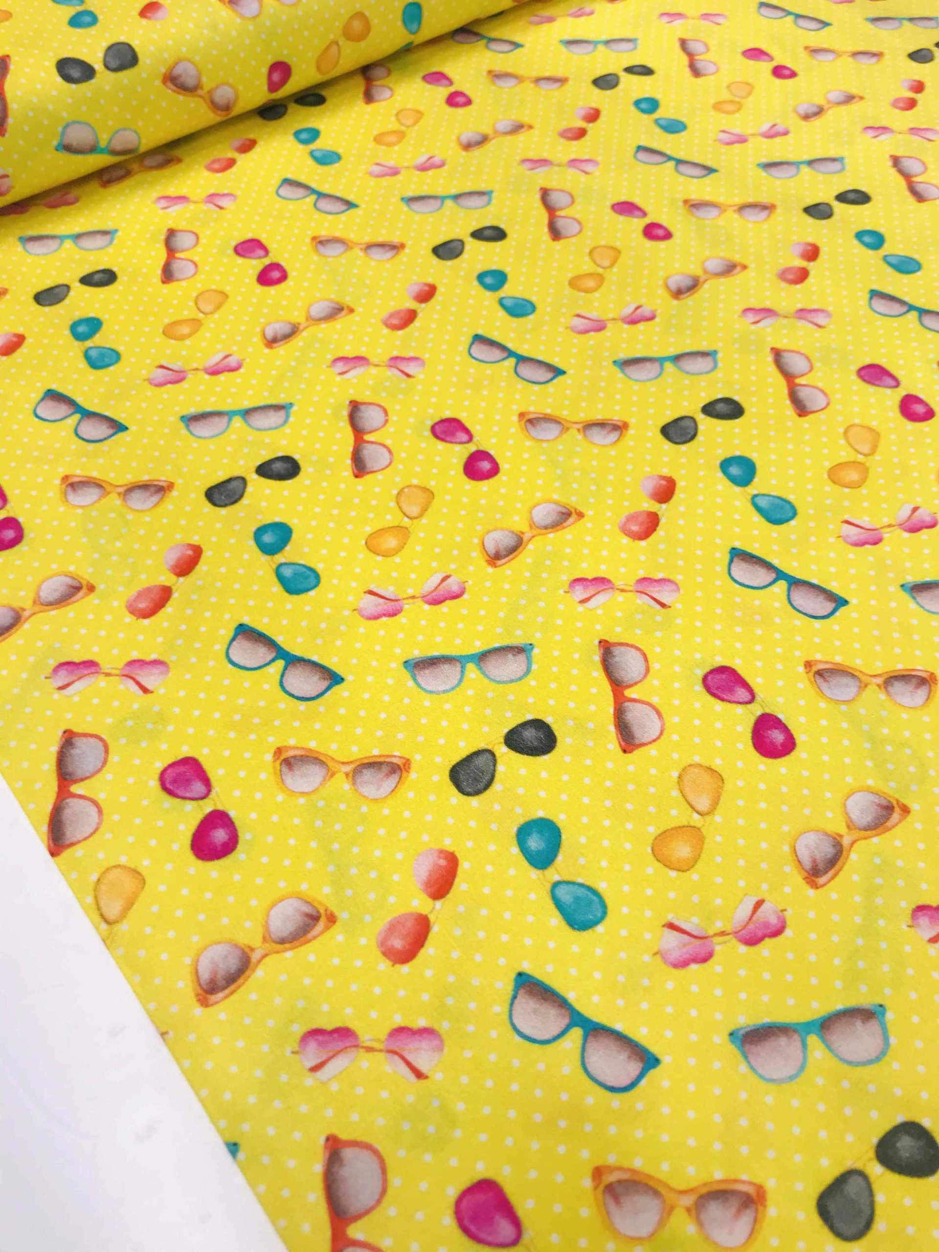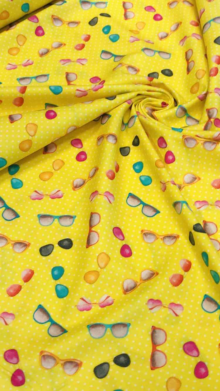 Tissu coton imprimé patchwork 115 cm Camping lunette – Fond jaune