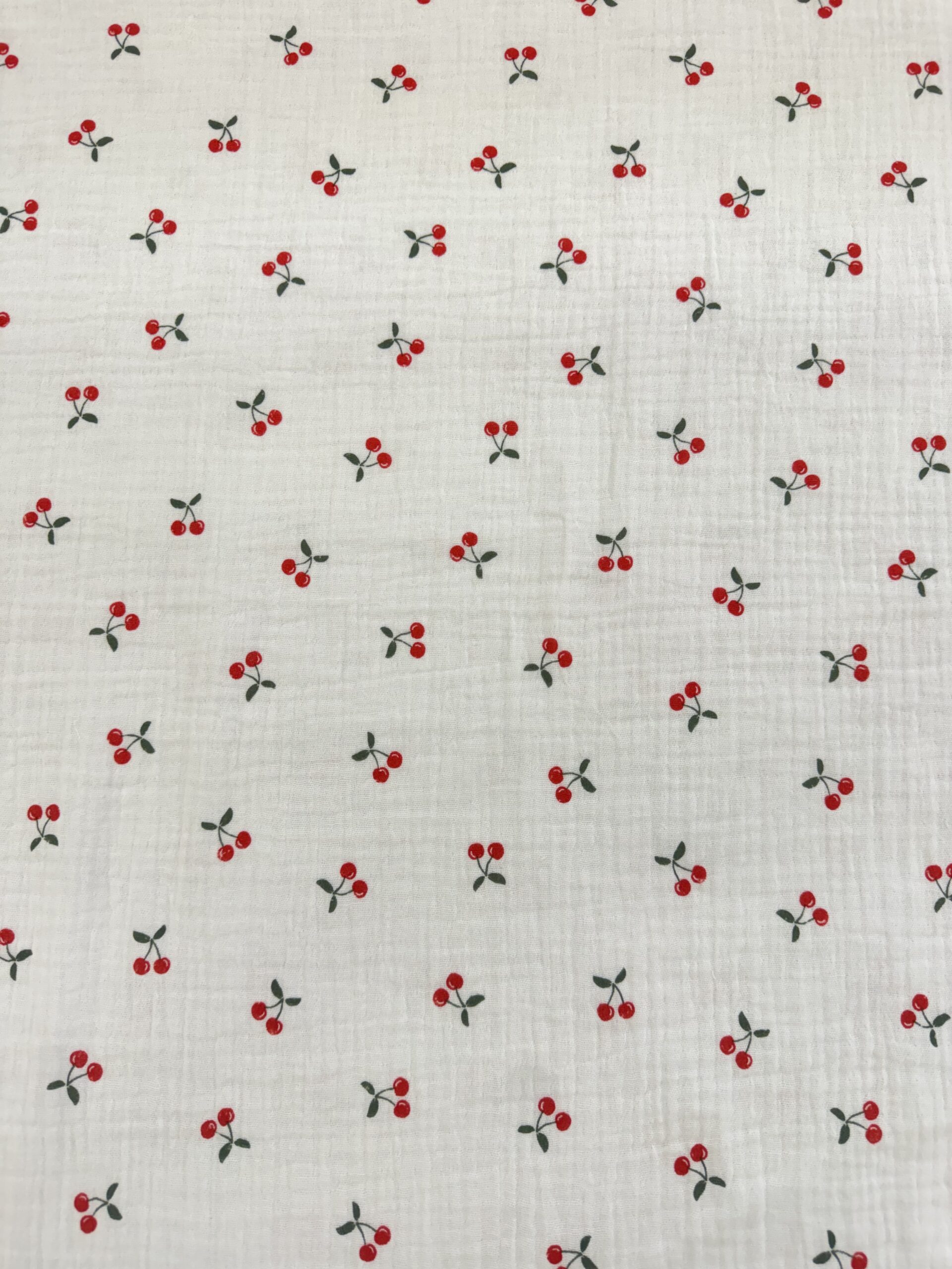 Son motif cerise sur fond blanc apporte une touche fraiche à toutes vos créations. Facile à coudre et agréable à porter, la double gaze de coton allie confort, élégance et praticité.