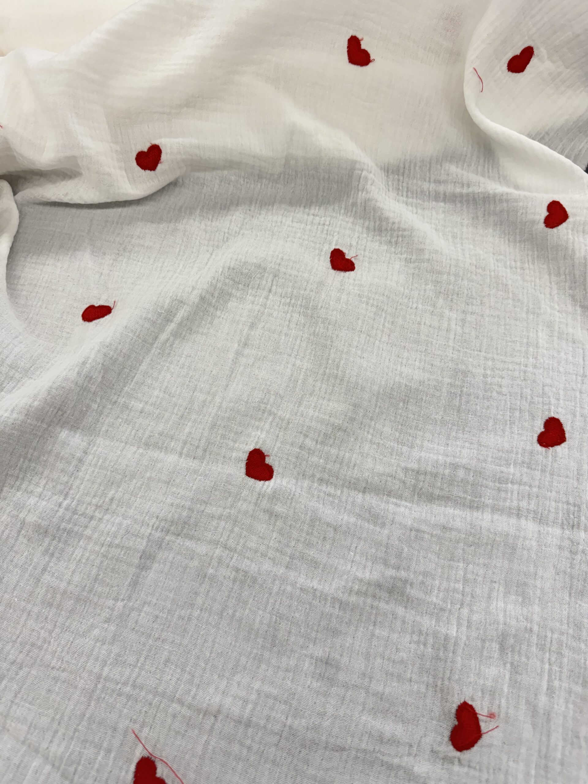 Son motif de petits cœurs rouge sur fond blanc, Facile à coudre et agréable à porter, la double gaze de coton allie confort, élégance et praticité.