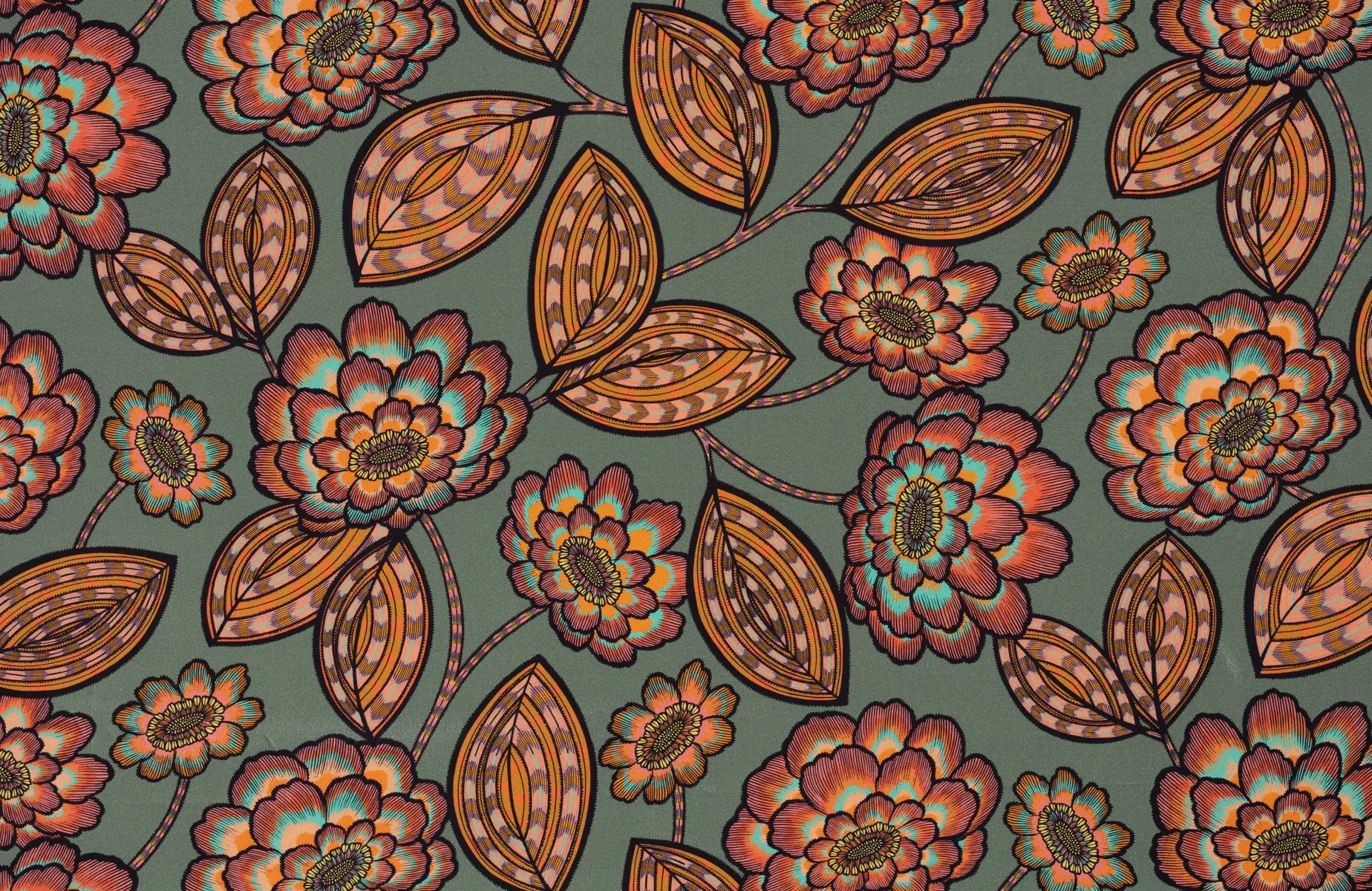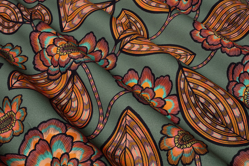 Tissu édition Thevenon Aline, haut de gamme et chic il arbore un motif floral des années 70 avec une finesse d’impression remarquable, fleurs et feuilles en orange, céladon, rose, sur fond sauge. Parfait pour déco intérieure, coussins, rideaux ou vêtements bohèmes. Résistant et facile à entretenir, idéal pour projets couture.